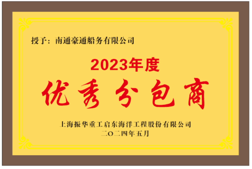 南通豪通船務(wù)獲上海振華重工啟東海洋工程股份有限公司2023年度“優(yōu)秀分包商”稱號(hào)